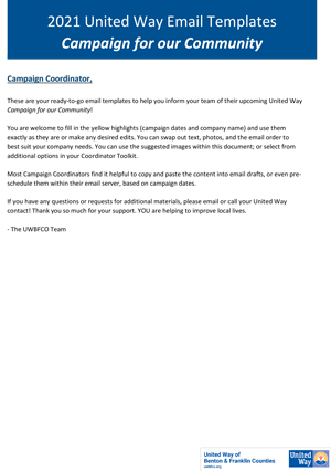 Thank you for taking part in United Way of Benton and Franklin Counties Campaign! Our online Campaign Toolkit will help guide you along the way and support your philanthropic mission at your organization. Below you will find downloads to all of United Way’s campaign materials, as well as logos and fundraising ideas to help make this an easy and fun giving initiative.